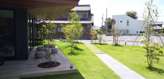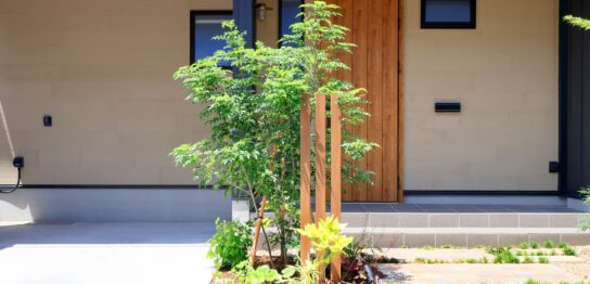 以前施工させていただいた現場へ写真撮影に伺いました📷 春先の完成当時にはまだ葉の出ていなかったイロハモミジも青々と葉を茂らせて夏を感じさせる空間に🌿 現場で高さを変えたウッド調ポールがそれぞれのシンボ